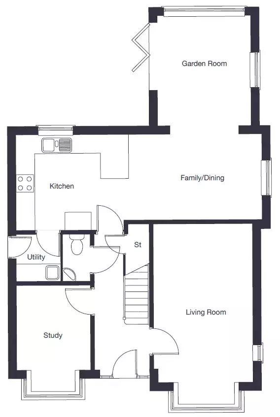 The Barbridge is a thoughtfully designed double fronted 4 bedroom home filled with natural light. The entrance hall leads into the living room with feature bay window, as well as an open-plan kitchen, family and dining area. A garden room provides an added space to entertain, connected seamlessly to the garden via bi-fold doors. The ground floor also offers a study, a private room to escape to within the home and a flexible space for work or play. Like the living room, the study has a feature bay window, flooding the room with light.