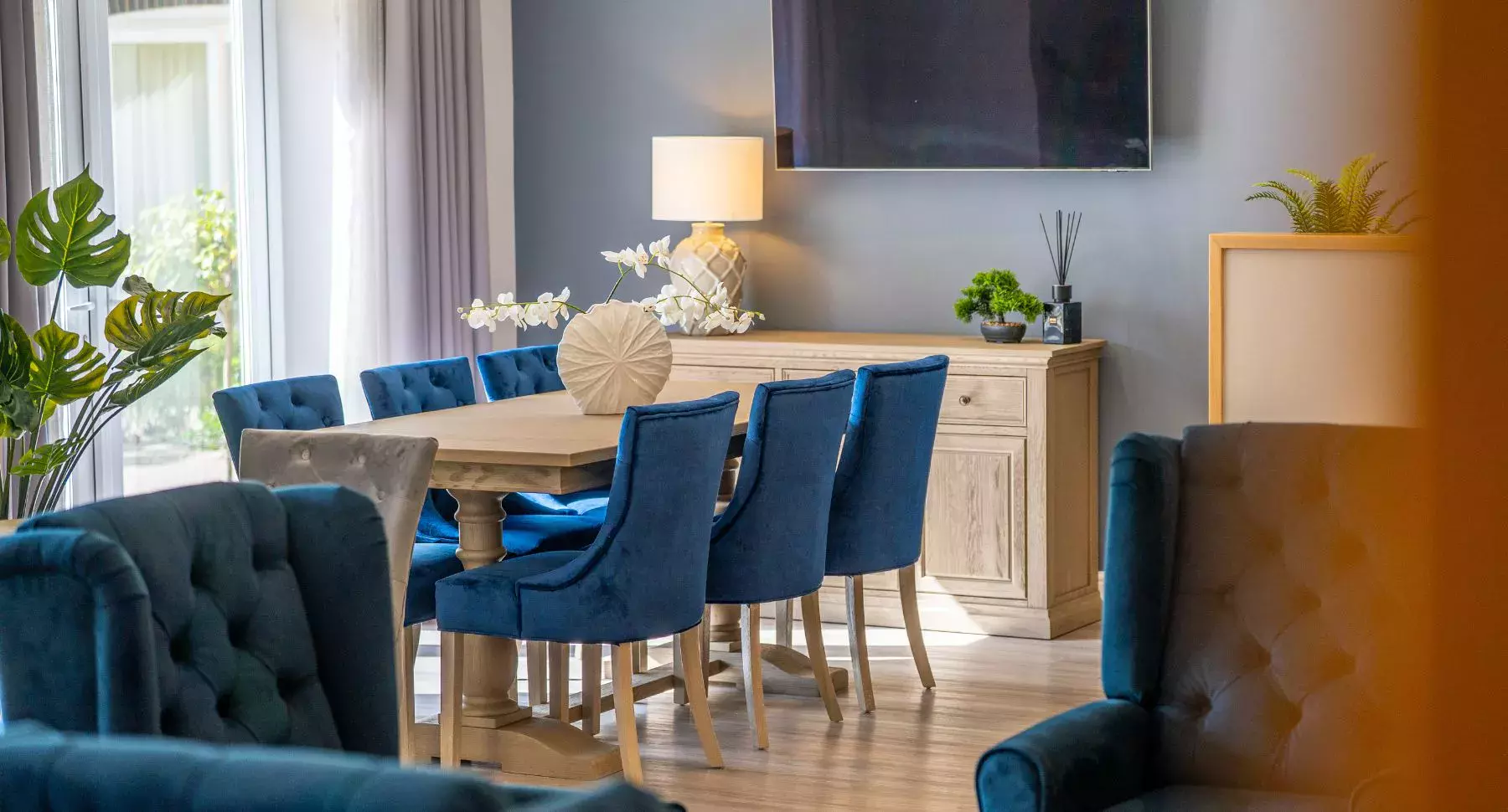 The real heart of the home is a stunning open-plan kitchen and dining area, complete with sleek granite worktops, Neff integrated appliances and ambient LED lighting. French doors lead to a spacious living room, offering a separate yet connected space for entertaining friends and family. The dining area flows seamlessly into the contemporary garden room, with large windows that bathe the space in natural light, creating a serene atmosphere for relaxing or hosting.