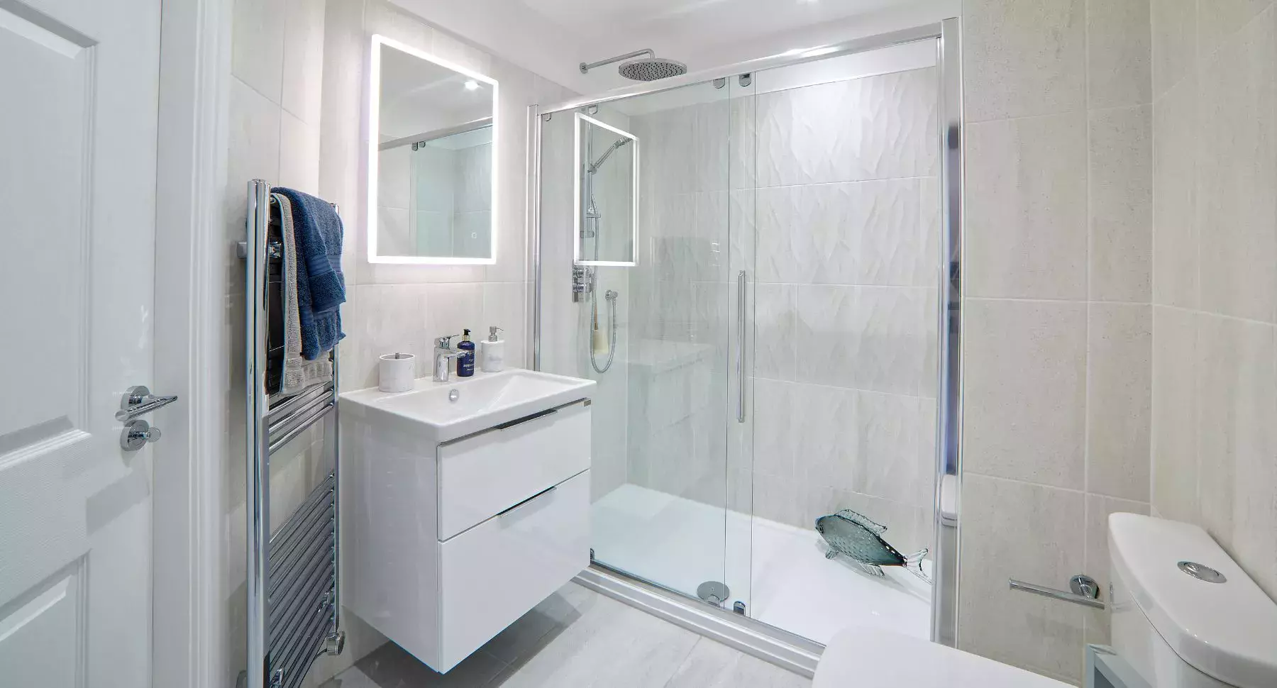 Upstairs, the first floor offers five generous bedrooms, four of which are large doubles. The first bedroom boasts fitted wardrobes and a modern en-suite, with a second en-suite in bedroom two. The family bathroom is beautifully finished with Porcelanosa full-height tiling, an Aqualisa Mian shower and high-end fixtures, including Vitra vanity units and illuminated mirrors, all designed to offer a spa-like experience at home.