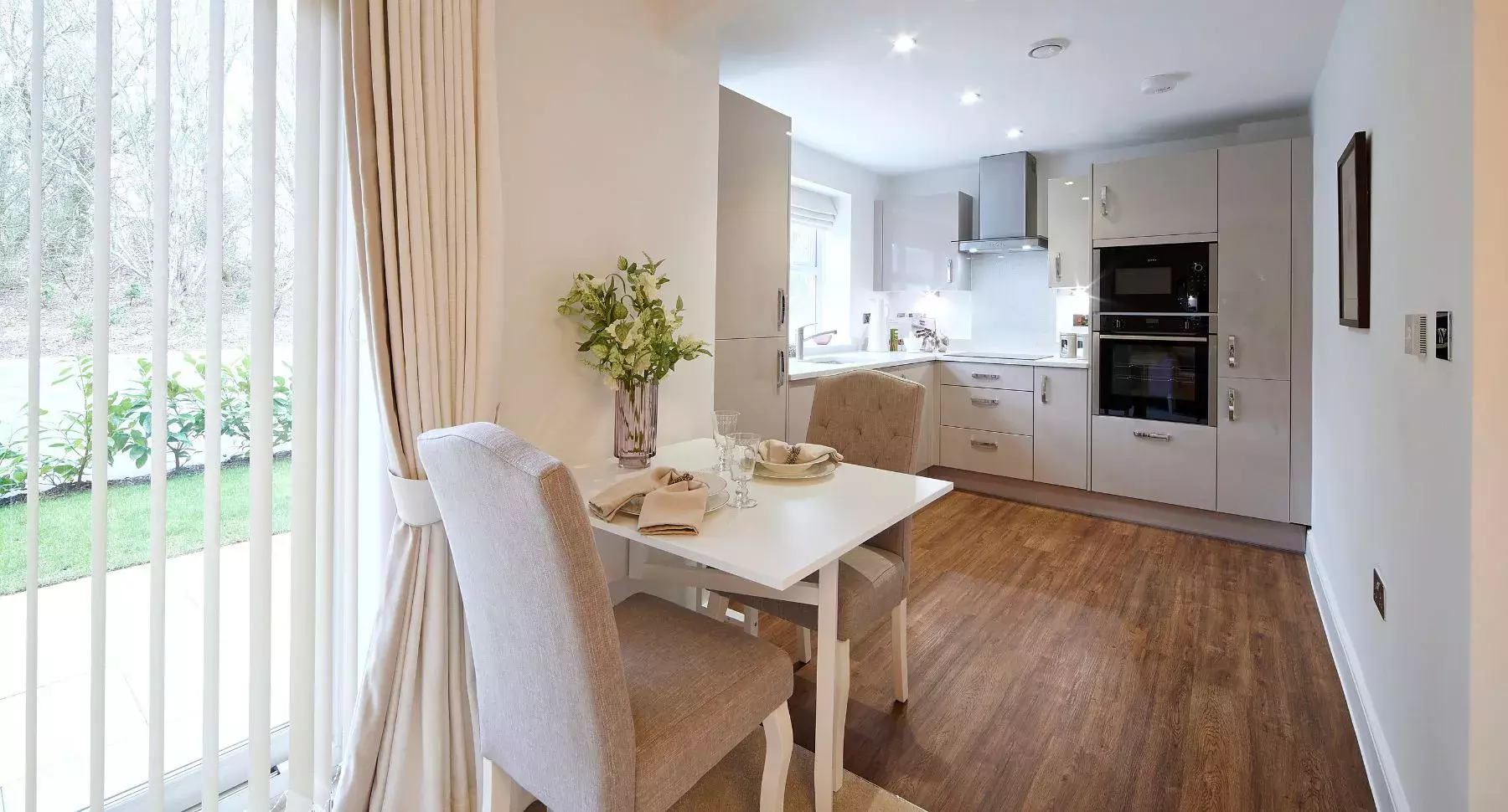 For first time buyers or those looking to downsize, The Cranford is a stylish two-bedroom mews home, perfect for those seeking new build homes in Wilmslow. The ground floor features a living room, leading through to a modern open-plan kitchen and dining room with patio doors leading out to the back garden, ideal for modern living and entertaining. The Cranford’s contemporary kitchen features beautiful laminate worktops and upstands, with lights under the wall units and Bosch integrated appliances.