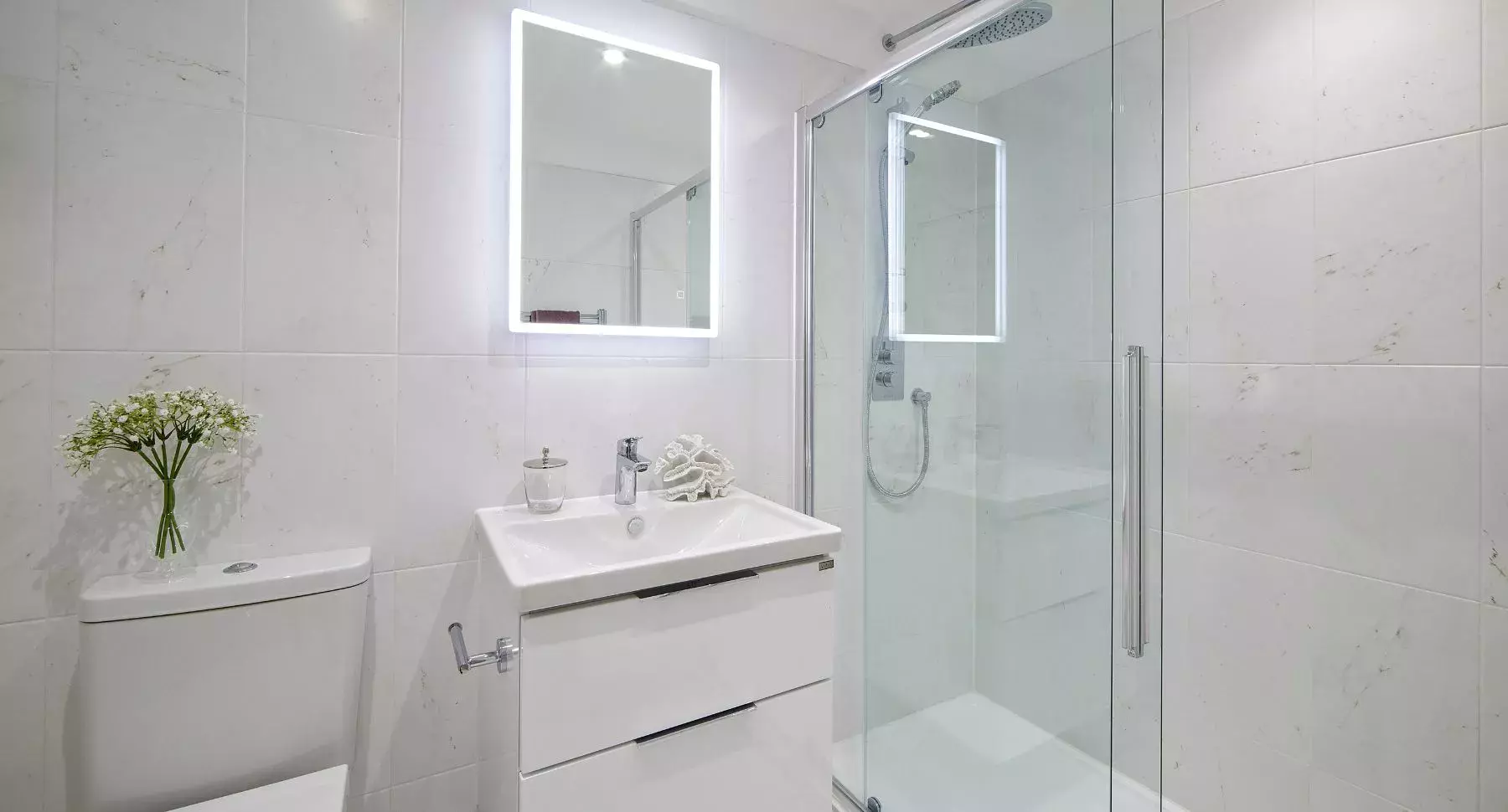 Heading upstairs, the first floor features a generous landing leading to four bedrooms – three doubles and one single. The first bedroom is complete with fitted wardrobes and a stylish en-suite, while the family bathroom includes both a bath and separate shower, all finished with luxury Porcelanosa tiling and chrome fixtures.