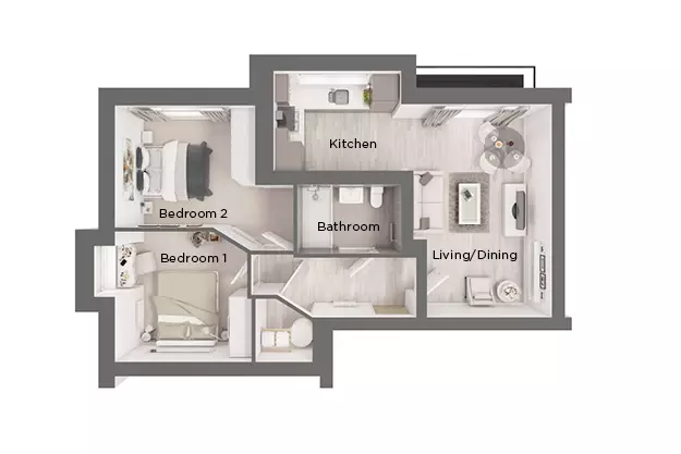 This apartment includes two large double bedrooms and a modern bathroom with a large shower. Offering the widest choice of location within the development, The Cheveley also provides access to the extensive Sanctuary Court amenities, including The Clubhouse, with its gym, spa and communal spaces. A 24-hour callout system creates a secure and engaging lifestyle.
