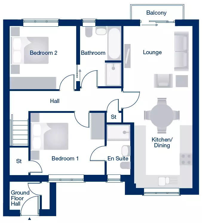The Ardington is a 2 bedroom first-floor apartment that blends modern design with functionality. The living and dining areas connect to the kitchen and open onto a private balcony, perfect for relaxed moments or entertaining.